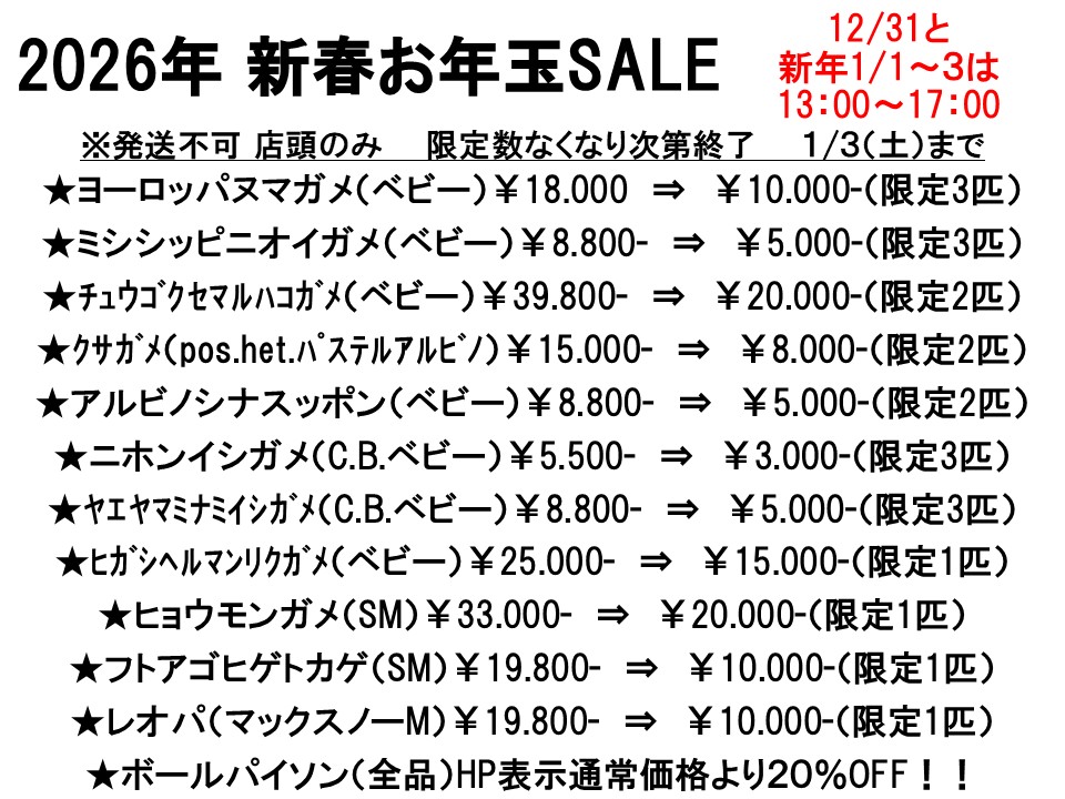★新型コロナウイルス感染防止の為、当面の間、購入目的の生体や用品の現物確認・販売に限定した営業となっております。お電話で在庫確認とご来店予約の上、お越しください。